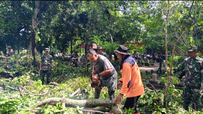 Selanjutnya, seluruh personel Kodim 0620/Kabupaten Cirebon bersama tokoh masyarakat, tokoh agama, tokoh pemuda, dan warga melaksanakan pemotongan pohon besar, ranting-ranting, serta pembersihan pendopo yang rusak akibat tertimpa pohon tumbang, dengan dibantu oleh BPBD Kabupaten Cirebon.