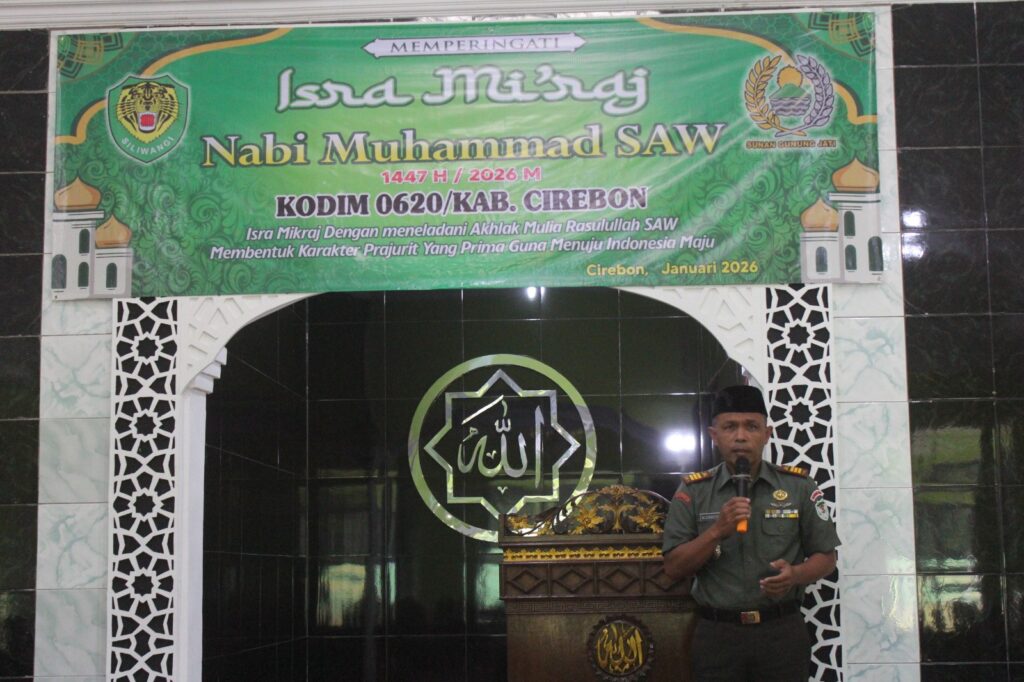 Cirebon –Senin, 26 Januari 2026. Kodim 0620/Kabupaten Cirebon menggelar peringatan Isra Mi’raj Nabi Muhammad SAW 1447 Hijriah/2026 M dengan mengusung tema “Isra Mi’raj 1447 H/2026 M dengan Meneladani Akhlak Mulia Rasulullah SAW, Membentuk Karakter Prajurit yang Prima Guna Menuju Indonesia Maju”