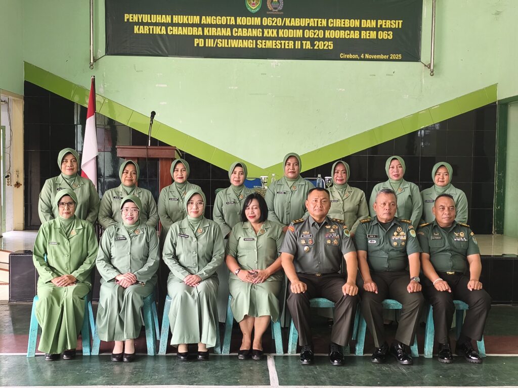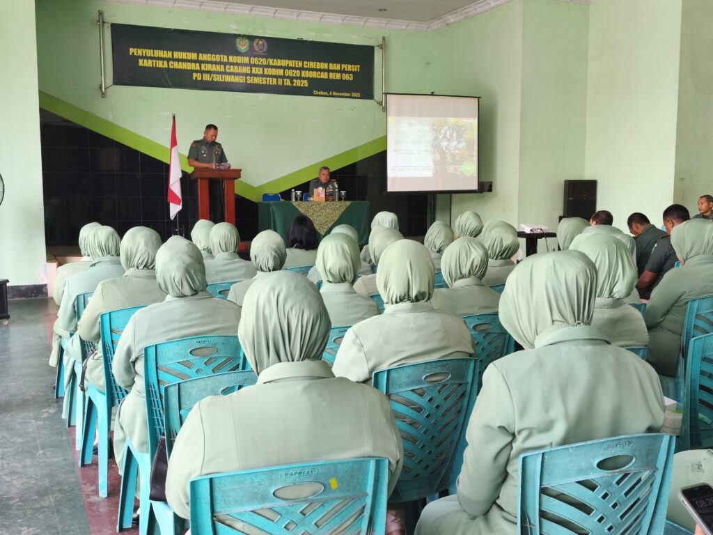Cirebon, 4 November 2025, Dalam rangka meningkatkan pemahaman dan kesadaran hukum di lingkungan TNI AD, Kodim 0620/Kab. Cirebon menyelenggarakan kegiatan Penyuluhan Hukum bagi prajurit dan Persit Kartika Chandra Kirana Cabang XXX Kodim 0620 Koorcab Rem 063 PD III/Siliwangi. Kegiatan tersebut berlangsung di Aula GSG Jati Manunggal Kodim 0620/Kabupaten Cirebon (4/11)